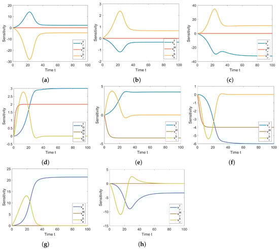 Each pair of respective entries in the matrix Equation (9) forms a differential equation. Therefore, from (9), we have a system of twenty four differential equations (the details of the equations are provided in Appendix A). We simulated the sensitivity by solving (9) numerically using ode45 in Matlab with initial values ( zeroes matrix). The simulation was performed with the parameter values in Table 1. The results are presented in Figure 4.