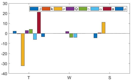 For the case of the parameters of the Michaelis–Menten function, in Figure 4a, we can see that the parameter affects T positively and S negatively, and on the other hand, the parameter k affects T negatively and S positively, as shown in Figure 4b. For the case of the other parameters, there are interesting findings regarding the effects of the changes of the parameters on the variables T and S. In Figure 4c, the parameter of the garbage level affects T negatively, which is obvious, and S positively. In Figure 4d to Figure 4h, all the parameters Q, , , a, and affect S positively and then negatively or otherwise from the starting time until some time point, but then, the sensitivity converges to zero. In other words, in the long term, those parameters will not affect the total nitrogen concentration in the soil solution at all. For the rest of the cases, the parameters Q, , and a affect T positively, as shown in Figure 4d,e,g, while the parameters and both affect T negatively, as shown in Figure 4f,h.