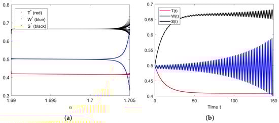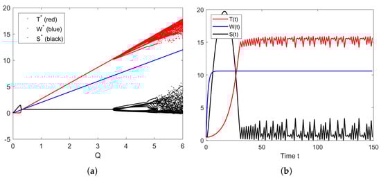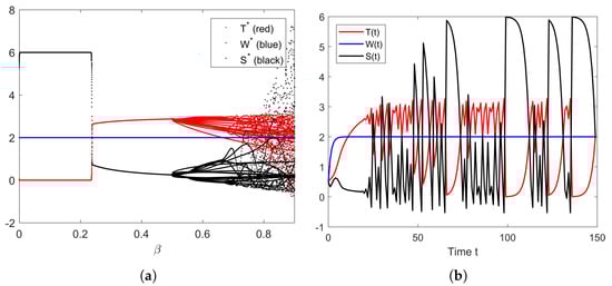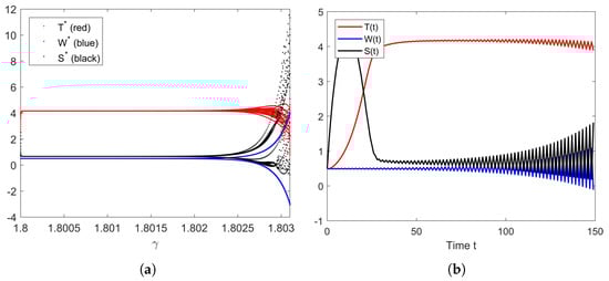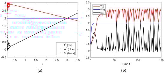 (a) Bifurcation diagram of parameter . (b) The solution’s behavior of the system (10) when .