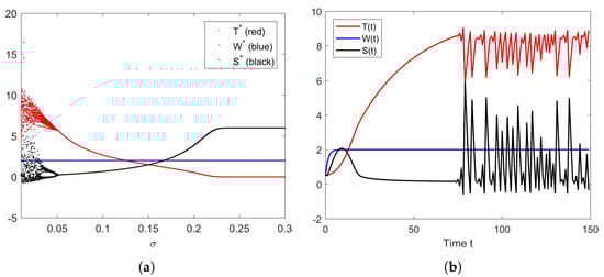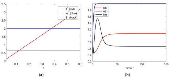 For the case of parameter a, as shown in Figure 12a,b, we do not see any interesting result when the bifurcation diagram is plotted. This happens because parameter a does not appear in the Jacobian matrices; thus, it does not contribute to the stability condition. The only clear result is that a higher a results in a higher equilibrium .