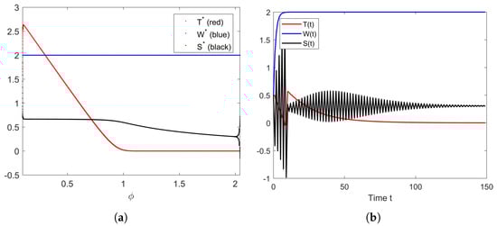 The bifurcation diagram of parameter is presented in Figure 13a. Most of the figure does not show any interesting dynamics. However, when we depict the behavior of the solution with , as given in Figure 13b, we obtain a quite interesting dynamics of the solutions and . They oscillate first before reaching the equilibrium.