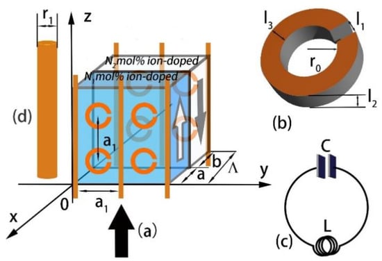 In order to elucidate the ideal of MEEPEM, we consider a composite structure consisting of a square lattice of the periodic arrays of conducting wires, PPCs, and SRRs shown schematically in Figure 1. In Figure 1a, for PPC, we choose ion-doped periodically poled lithium niobate crystal with the periodic concentration of the impurities in the positive and negative domains (IPPLN). The IPPLN can be produced by the Czochralski method [,,], and the doping of ions does not change the symmetry of lithium niobate [,,]. The ion-doped concentration of the IPPLN changes periodically; thus, the physical properties of IPLLN will be periodically changed. The ferroelectric domains of the IPPLN are periodically reversed along the x axis. We denote a and b as the thicknesses of positive and negative domains, respectively, and mol% and mol% () as ion-doped concentrations in positive and negative domains, respectively. The period of domains is , and the duty cycle is r = a/b. The thickness of the MEEPEM is along the x axis. The unit cell size of the MEEPEM is . For simplicity, we choose the single-ring geometry of a lattice of cylindrical SRRs. The micro-structured material has been proposed and constructed to create left-handed metamaterials []. The SRRs are installed on the two surfaces of PPC along the x axis, and the directions of the gaps of the SRRs sharing a common axis are the same. The SRR can be equivalent to the LC oscillator with the capacitance C of the SRR gap, an effective inductance L, and resistance R. Figure 1b,c show the comparison of an equivalent LC circuit and a metallic SRR. The parameters of SRR are marked in Figure 1b: the gap size l1, the thickness l2, the width l3, and the radius . In Figure 1d, is the diameter of the conducting wire.