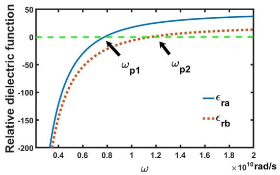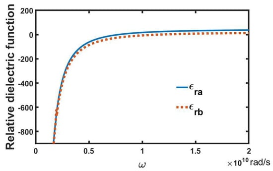 Figure 3 and Figure 4 show the high and low angular frequency regions of the dielectric spectrum in Figure 2, respectively. From Figure 3, the real parts of two dielectric functions and in the positive and negative domains exhibit negative values below angular frequencies and , respectively. If we do not consider PPC and SRRs in the MEEPEM, the effective nonlinear dielectric permittivity of the periodic arrays of conducting wires is written as []: