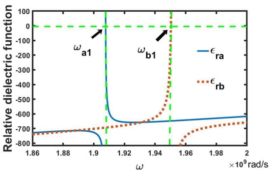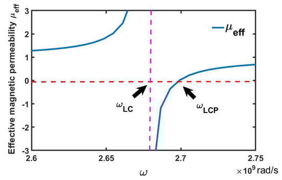 From Equation (33), the real part of the effective magnetic permeability function of SRR is shown in Figure 8, which is represented by the blue solid lines; here, m, m, and m. As can be seen in Figure 8, there is one anomalous peak near the magnetic resonance angular frequency = 2.68 Grad/s. The effective magnetic permeability exhibits negative values in the angular frequency gap (, ), i.e., PBG, in which the propagation of EM waves in MEEPEM will be forbidden, where = 2.70 Grad/s, which can be obtained by setting = 0 in Equation (33). Upon inserting in the expression − , we can obtain the width of the PBG. While in the PBG (, ), the real parts of two dielectric functions and also exhibit negative values. That is, both the magnetic permeability and dielectric permittivity of the MEEPEM are negative, and the MEEPEM will become the left-handed metamaterial with negative refraction [,,,,]. In the MEEPEM, the condition for obtaining a negative refractive index is < min (, ), which can be obtained by adjusting the structural parameters of the SRRs in MEEPEM.