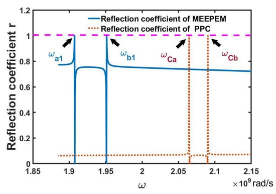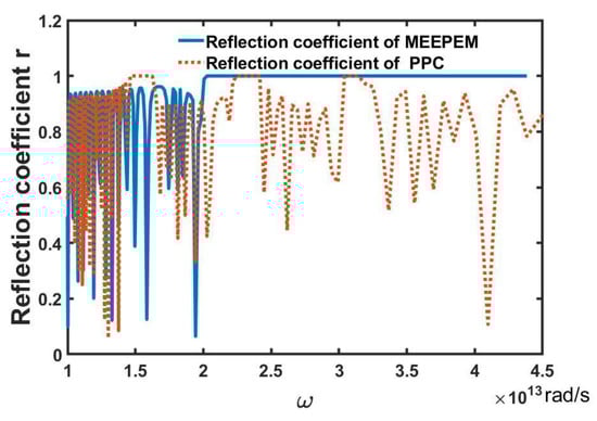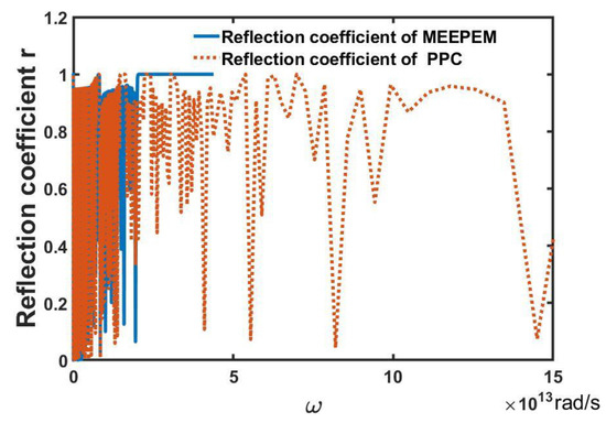 In Figure 5, the entire reflection spectra of the MEEPEM and of the PPC are represented by the blue solid line and red dashed line, respectively. Here, the PPC is the IPPLN mentioned above. Figure 6 shows the cases in the low frequency region in Figure 5. In Figure 6, the reflection spectrum of the MEEPEM shows two reflection peaks and two zero reflection coefficients near the resonance angular frequencies and of the first-order multi-field coupling polaritons. Similar cases also exist in the reflection spectrum of the PPC. While the positions of two reflection peaks of PPC are higher than those of MEEPEM due to the resonant angular frequencies of PPC, they are higher than that of MEEPEM. In addition, the intensities of two reflection peaks of PPC are weaker than those of MEEPEM because the coupling of three fields in PPC is weaker than that of MEEPEM. We know the dielectric permittivity is a key factor in the calculation of the reflection coefficients. Therefore, the dielectric anomaly phenomena lead to the changes in the reflection spectra of the MEEPEM and PPC in Figure 6.