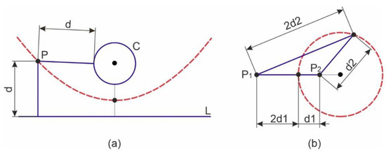 A geometric locus (Figure 1) is an entity in which all points, whether in the plane or in space, fulfil a given geometric condition (e.g., distance, angle, another parameter). In other words, a locus is a set of points that share the same metric condition. The plural of locus is loci. Relying on this definition to solve graphical problems involving tangents proved highly useful in the past as it allowed a substantial number of graphical procedures to be replaced by a unified approach [30]. However, the range of potential cases is almost unlimited, and each individual instance must be examined in isolation for optimal resolution [29].