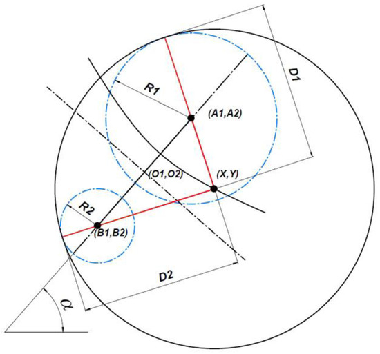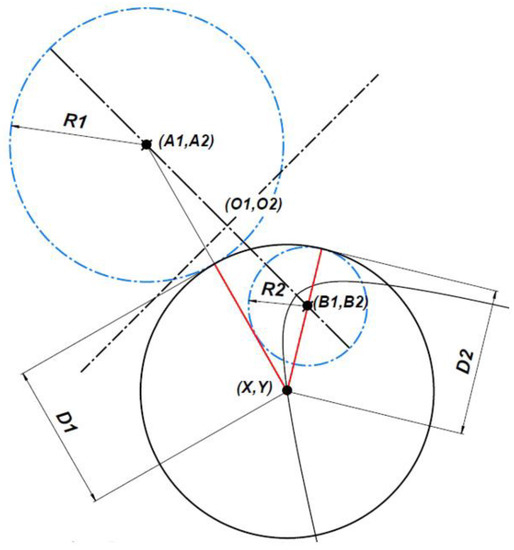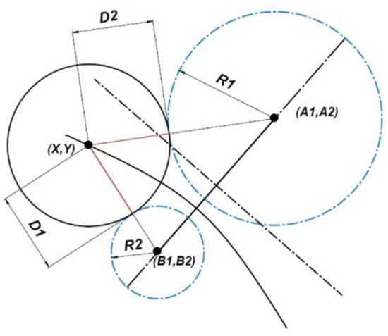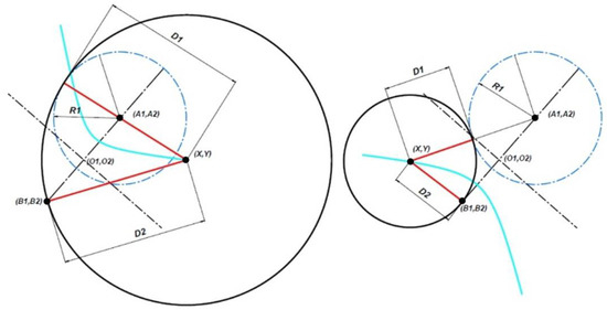 The geometric locus of the points with variable coordinates (X1, Y1) (i.e., the curve where the centres of circles tangent to the given circle of radius R1 and centre A (A1, A2) that also pass through the point B (B1, B2)) is shown in cyan in Figure 2. Although the Figures are shown separately for easier understanding, the circle and the point in both are identical. Also, the geometric loci are the two branches of a hyperbola whose axis is at one-half the distance between points A (A1, A2) and B (B1, B2) and normal to the connecting segment. One of the circles for each case is highlighted in black in the Figure. D1 and D2 are the distance between the original entities’ circles and point to the point (X, Y) of the loci curve, respectively. According to the definition of the locus, D1 and D2 are equal.