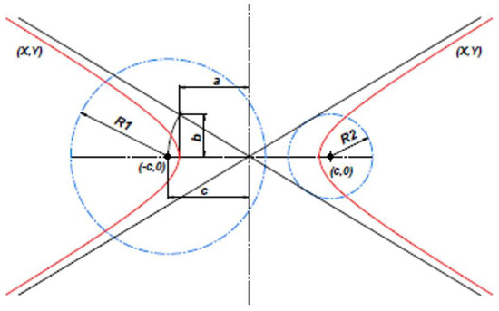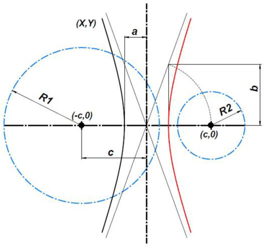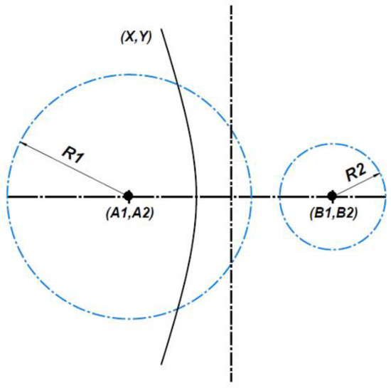 As can be seen, the points in the curve (X, Y) must meet the condition that the difference between the distances at two points A (A1, A2) and B (B1, B2) should be constant and identical with the difference between radii, which constitutes the definition of a hyperbolic branch. Simply making R2 = 0 provides the equation for one of the branches of case A (a circle and an external point), which is depicted in Figure 2, left.