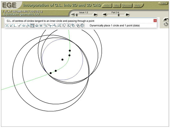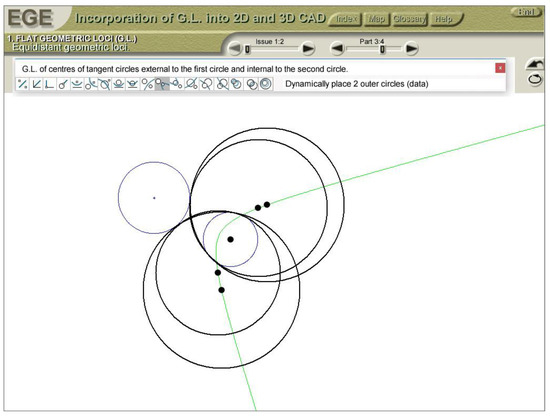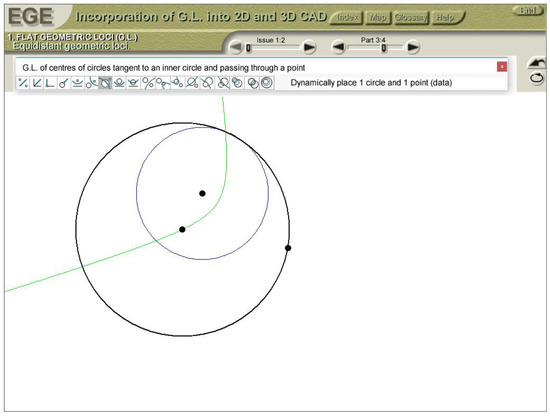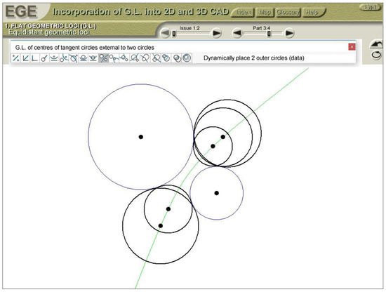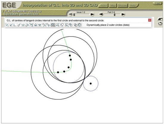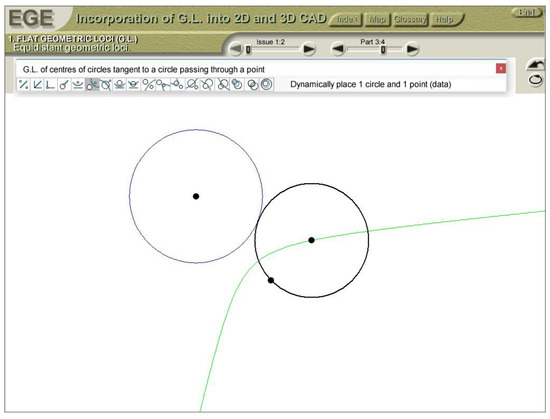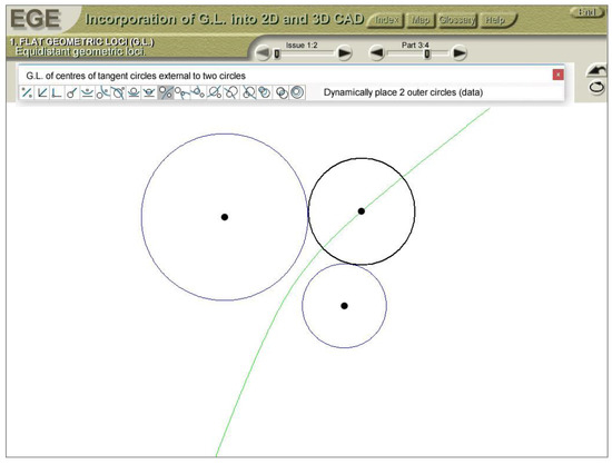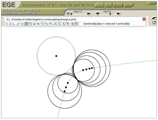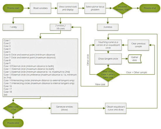 The primary aim of this work was to develop a software tool to simplify and automate the identification and viewing of geometric loci in the plane. Loci problems are considered difficult in mathematical and graphical subjects all over the world [27], and their visual information can be useful in learning and professional contexts [28]. The tool, which is intended for educational used, can be implemented in any type of commercially available CAD software. This is because the application involves, as an input of their functions, simple entities that exist in current CAD software (points, line, circumferences, etc.) and mathematical equations to calculate the graphical solution. Although the range of potential problems involving planar loci is almost unlimited, the proposed tool was conceived to address only a few. Its potential benefits where previously discussed by the authors elsewhere [29]. No similar tools have to date been reported. Research started by identifying geometric locus cases of special engineering significance. Then, geometric mathematics was used to solve each individual case, and the procedure was implemented, as a function, to allow future users to select the most suitable among those provided according to the particular case to be addressed. The major advantage of the tool is to be able to get the solution to different loci problems in plane only through the selection of the graphical entities involved in the problem and also the selection of the type of loci case. In contrast with commercial available software, there is no need to make any graphical procedures. All functions of the tool were checked for correct performance.