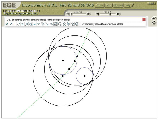 For example, the practicality of the proposed tool is demonstrated here by solving the following problem: identifying the geometric locus of the points falling at the maximum possible distance from two given circles (Case 1). Such a locus will contain the centres of all circles internally tangent to the two given circles (Case 3). This problem has an infinite number of solutions that can be reduced to a unique one by imposing some constraints.