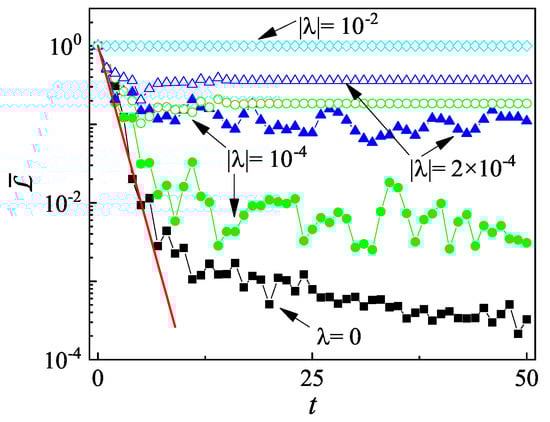 where represents a perturbed Hamiltonian on the original one [6,33,34,35]. It is known that for chaotic systems, the Loschmidt echo exponentially decays with time, for which the decay rate is proportional to the Lyapunov exponent of the classical limits. Accordingly, the dynamics of reflects a kind of quantum-classical correspondence of chaotic systems. For the Hermitian QKR, the classical dynamics is governed by the kicking strength K, which is fully chaotic for with the Lyapunov exponent [36].
