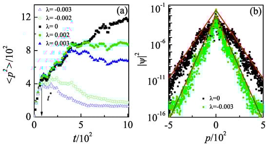 (a) The versus time with = −0.003 (empty triangles), −0.002 (empty circles), 0 (squares), 0.002 (solid circles), and 0.003 (solid triangles). Arrow marks the threshold time . (b) Momentum distributions at the time for (squares) and −0.003 (circles). Solid lines indicates the exponential function with and 15 for and −0.003, respectively. Other parameters are and .