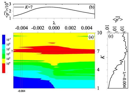 (a) The time-averaged value of mean energy in the parameter space with . (b) The versus with . (c) The versus K with .