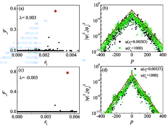 Left panels: Dependence of at the time on the imaginary part of the quasienergy with (a) and −0.003 (c). Right panels: Comparison of the probability density distributions between the state (circles) and the quasieigenstate (squares) of the maximum value of (red diamonds) with (b) and −0.003 (d). (d) Red lines indicate the exponentially-localized shape with (b) and 15 (d). Other parameters are the same as in Figure 2a.