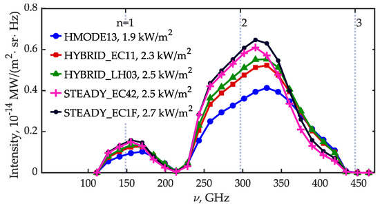 Figure 1 shows the results obtained using Formulas (3) and (4) for the spectral intensity emerging from the plasma to the first wall for low EC harmonics n = 1 and n = 2 and the corresponding EC energy flux density for all considered scenarios of ITER operation. Note that, in our calculations, the EC radiation spectrum at low EC radiation harmonics does not depend on the EC radiation reflection from the wall.