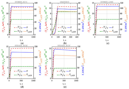 Evolution of the following parameters: volume-averaged values of electron temperature, <Te>V, and density, <ne>V; total (i.e., integrated over frequencies of moderate and high harmonics, n ≥ 3) EC radiation energy flux density, F, emerging from the plasma to the first wall, calculated by the CYNEQ code for wall reflection coefficient Rw = 0.9; similar value obtained from the locally applied Trubnikov formula for total power losses (Equation (A.1a) in [18]), FLATF. (a) ITER scenario with improved confinement (scenario No. 1 in Table 1); (b) hybrid operation scenario with ECH (scenario No. 2 in Table 1); (c) hybrid operation scenario with ECH+LH (scenario No. 3 in Table 1); (d) steady-state operation scenario with injection of 13.3 MW of ECH power (scenario No. 4 in Table 1); (e) steady-state scenario with injection of 20 MW ECH power (scenario No. 5 in Table 1).