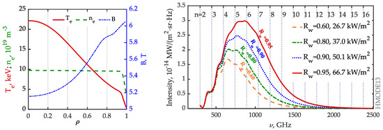 where rres is the radial coordinate (in the torus poloidal cross-section) of the wave–particle resonance region for the propagation of the EC wave perpendicular to the magnetic field and B(r) is the local magnetic field (in which the tokamak is proportional to 1/R, where R is the torus radial coordinate in the poloidal cross-section). The spectral intensity of the EC radiation, differential in solid angle, can be calculated by Equations (3) and (4). The accuracy of this approach can be estimated from the comparison in Figure 3 in [26] of two angles of the observation/collection of EC radiation, which shows the simulation of EC emission spectra at low harmonics in ITER using the SPECE code [27] and calculations using Equations similar to (3) and (4). From the results of [26] and the present work, it is clear that the accuracy of Equations (3) and (4) in estimating the frequency-integrated thermal loads is satisfactory.