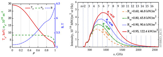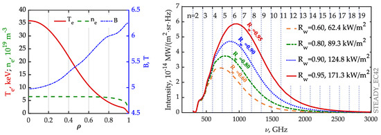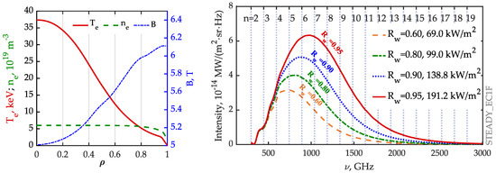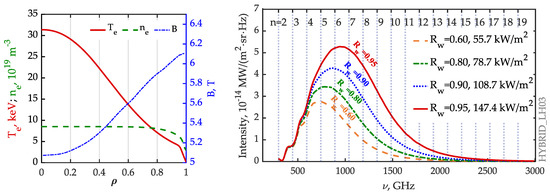 Note that the EC radiation intensity at low harmonics coming from the optically thick (for a given frequency) region of plasma is isotropic. When the direction of the observation chord deviates from the direction perpendicular to the magnetic field, and when the chord crosses the toroidal plasma column in a short section near the plasma surface, Equation (4) is no longer applicable, and a detailed calculation is required for the spectral–angular distribution of the outgoing radiation intensity in the corresponding range of angles and frequencies. In general, for the simulation of the EC radiation spectra at low harmonics, it is necessary to consider all the features of the propagation of EC waves in plasma, including the reflection of waves from cut-off zones, polarization scrambling at wall reflections, etc. Accurate modelling of the EC radiation spectra from plasma at low harmonics is performed using the following methods: single-pass ray-tracing calculations using the SPECE code [26,27]; and the approach described in [28], which relies on the ensemble-averaging of rays traced through many randomized wall reflections. However, the details of the spectrum of the outgoing EC radiation at low harmonics, as we will see below, are not critical for the assessment of the possible contribution of plasma-generated EC radiation to the thermal and electromagnetic loads on various diagnostics, on the first wall, and in regions behind the blankets and in the port plugs.