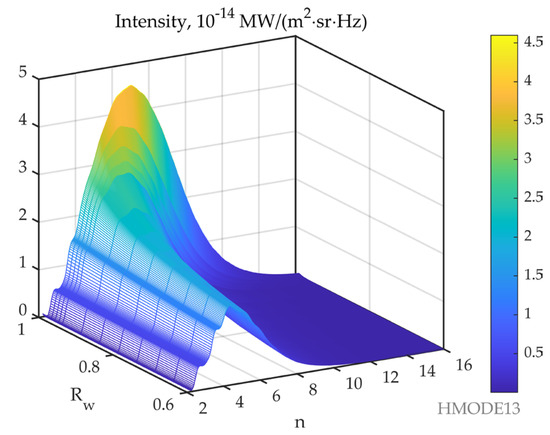 Figure 3, Figure 4, Figure 5, Figure 6 and Figure 7 show the calculations of the spectral intensity emerging from the plasma to the first wall, J, for all considered scenarios at fixed values of the reflection coefficient of the EC wave from the vacuum chamber wall, Rw = [0.6, 0.8, 0.9, 0.95]. Figure 8 shows J as a function of EC cyclotron harmonic number, n, and wall reflection coefficient, Rw, in the scenario of ITER operation with improved confinement (scenario No. 1 in Table 1, HMODE13).