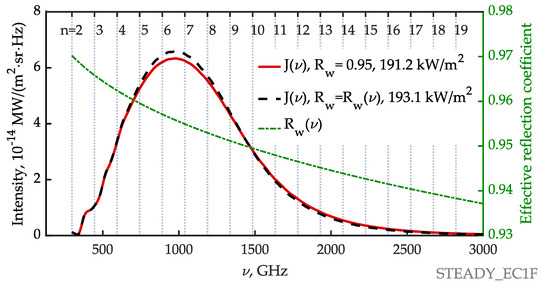 Comparison of the spectral intensity of the outgoing plasma-generated EC radiation for scenario No. 5 in Table 1, calculated using the CYNEQ code for reflection coefficient Rw = 0.95 and effective reflection coefficient Rw = Rw(ν) (see right y-axis), taken from [4] (see Figure 7 therein, red curve, wall temperature t = 300 °C). The legend shows the frequency-integrated energy flux density of the EC radiation emerging from the plasma to the first wall.