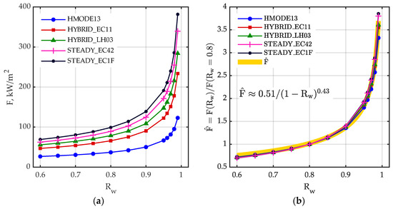 Energy flux density, F, of the plasma-generated EC radiation emerging from the plasma to the first wall in the ITER scenarios shown in Table 1: (a) total (i.e., integrated over frequencies of moderate and high harmonics, n ≥ 3) value of F; (b) comparison of the normalized value of F with the approximate Formula (8).