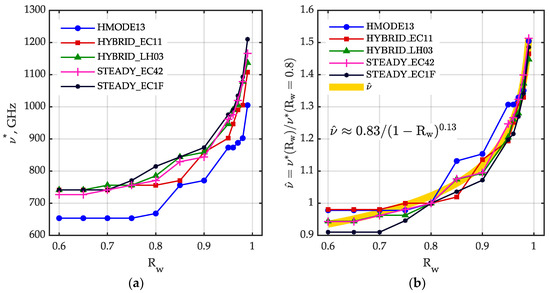 The EC radiation energy flux density emerging from the plasma to the wall as a function of Rw and the scaling law for its normalized value for all considered scenarios are shown in Figure 10. Frequencies corresponding to the maximum EC radiation intensity as a function of Rw and the scaling law for the normalized frequency are shown in Figure 11.