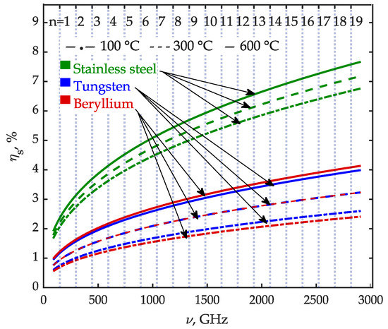 For the estimation of the thermal loads on various internal chamber elements caused by the absorption of plasma-generated EC radiation and of ECRH/ECCD-produced stray radiation, we calculated the absorption coefficient of EM waves for metal surface (using Fresnel equations), averaged over polarizations and incidence angles, for three materials (stainless steel, tungsten, beryllium) at different wall temperatures (for detailed description of this approach, see Section 5.8.5 in [35] and Equations (2)–(10) in [4]). Data on the electrical resistivity of tungsten and beryllium are taken from the table in Section 12–42 in [36], and data on the resistivity of stainless steel (type 316L(N)-IG) are taken from Table 2 in [37]. The material absorption coefficients as a function of frequency for isotropic stray radiation are shown in Figure 12. For the considered wall temperatures (100–300 °C for the start-up stage of discharge and 600 °C for the flat-top stage of discharge), the values of the absorption coefficient, ηs, for beryllium and tungsten are very close, while the absorption coefficient for stainless steel is approximately twice as high. Calculations of the absorbed energy density of plasma-generated EC radiation, Fabs, in the considered scenarios of ITER operation and of the stray radiation from ECRH/ECCD systems, Fabs,inj, at the start-up stage of the discharge in ITER are presented in Table 4 and Table 5 for stainless steel and tungsten materials. Fabs and Fabs,inj values of stainless steel are approximately twice as large as those of tungsten. The ratio of Fabs and Fabs,inj for stainless steel material is shown in Figure 13 for five scenarios of ITER operation.