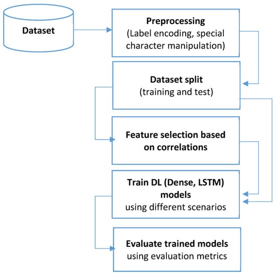 After that, the DL models will be built and trained based on many training scenarios, including different splitting criteria, different DL architectures, and with or without feature selection. Figure 2 illustrates the proposed methodology for both datasets.