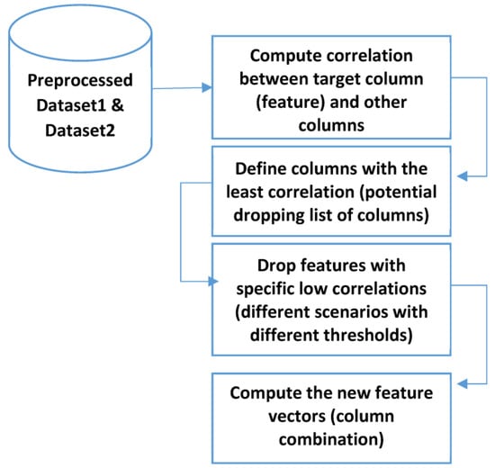 Then a list of potential dropped columns is prepared. Different selection scenarios can be made since the correlation ranges between 0 and 1. The selection step is based on the number of desired columns, so we will obtain the K number of required features and drop the rest. For the second dataset, the same approach will be applied except for the selection step. Specific correlation thresholds (T) will be used to eliminate columns since the number of columns in the second dataset is 214. So, in the second dataset, the number of selected features depends on the chosen threshold, which is not defined as in the first dataset.