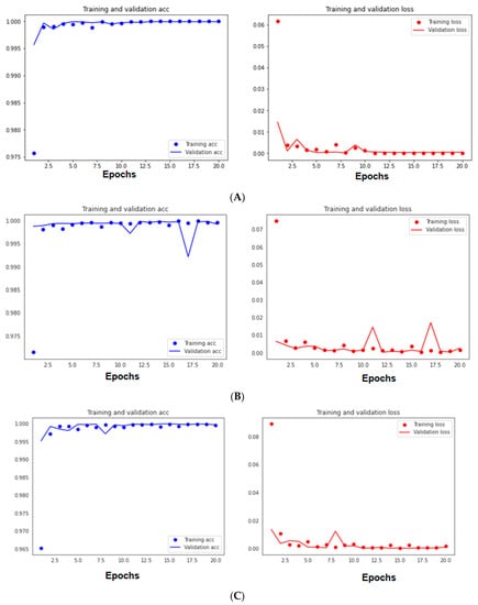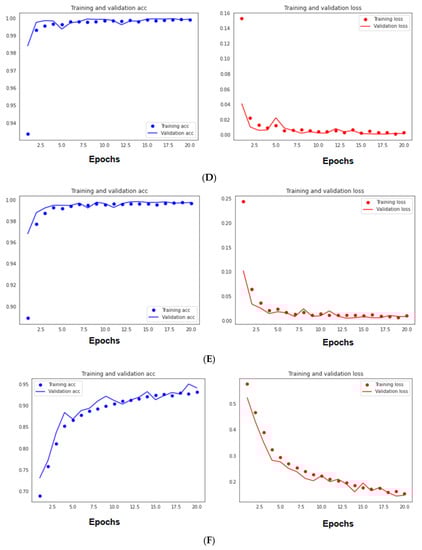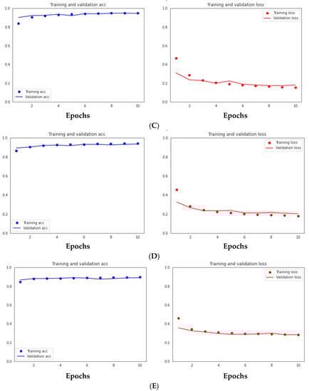 Training/validation accuracy and loss of the six scenarios of the second dataset: the five scenarios are numbered from (A–E).