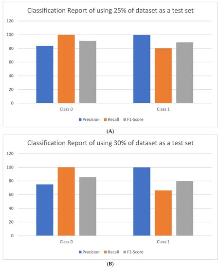 Table 6 shows that increasing the test set percentage will decrease the performance. The main problem of using more test samples appears with the recall of “0-class” samples (the benign samples) and the precision of the “1-class” samples for 25% splitting scenarios, as shown in Figure 6a. The same results are concluded for the 30% split scenario (as shown in Figure 6b). To conclude, the best splitting scenario is using 20% of the test set, and any further increase in test samples will affect either the acceptance rate or the rejection rate (recall and precision).