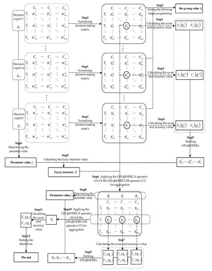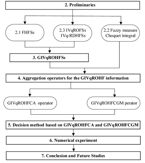According to the above, we organize contents (see Figure 1). Section 2 focuses on the basic knowledge involving the HFSs, fuzzy measure, Choquet integral and IVqROFSs. The concept of the GIVqROHFSs is proposed and some operational rules of the GIVqROHFSs are introduced in Section 3. The GIVqROHFCA and GIVqROHFCGM operators are developed in Section 4, and some properties of these two operators are discussed. By the proposed operators, Section 5 demonstrates a new MAGDM approach for processing the GIVqROHF information. The contents of Section 6 include an illustrative example and two number experiences such as sensitivity analysis and compared experience. Some remarks are presented in Section 7.