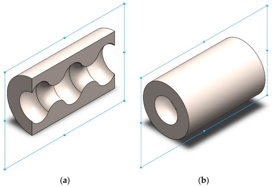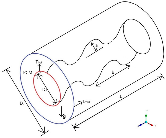 Figure 1 depicts the physical geometry under consideration. The diagram depicts both boundary conditions and coordinates. The inner pipe acts as a heater in this design, while the outer tube is cooler than the inner tube. The PCM is filled between the inner and outer tubes. Several amplitude ratios are investigated, as shown in Table 1. The temperature of the inner tube is T = 50 °C. The temperature of the inner tube, on the other hand, varies between 80 and 110 degrees Celsius. Figure 1 depicts the parameters a = 8, 12, 16, and 20 mm. It indicates that the impacts of temperature differences are being investigated. The solid model’s cross-section is shown in Figure 2a, and the model’s isometric presentation is shown in Figure 2b.
