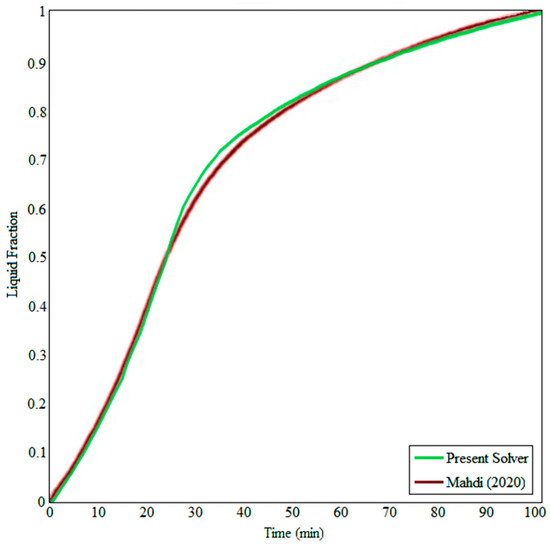 The code is validated using the study’s literature to check if it is correct. As a result, Mahdi et al. [21] were selected for their research on the use of a double-pipe, helical-coiled tube as a novel and high-performance PCM containment design for latent heat thermal energy storage systems. The outcome, as shown in Figure 4, demonstrates that the works are equivalent.