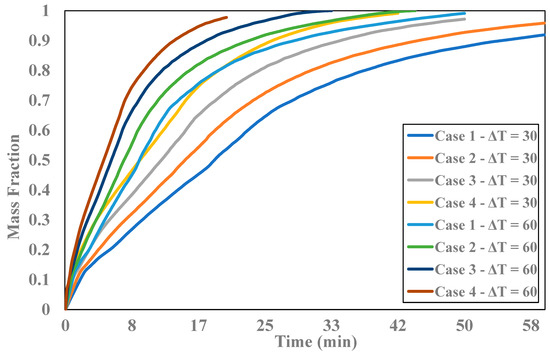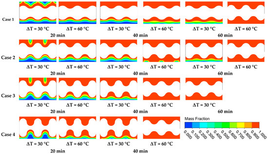 Figure 5 depicts the mass fraction for various temperature differences and time periods in various instances. Heat transfer is primarily accomplished by conduction for all temperature levels when the amount of liquid PCM is modest at the start. Surface waviness is an important parameter for melting and it shows the positive effects on melting time. Fully melting occurs on the top side of the wavy pipe except for the lowest value of temperature difference and Cases 1, 2, and 3. At the same temperature difference value, there is no unmelted PCM for Case 4. There is fully melted PCM is observed for ΔT = 60 °C for all cases. Additionally, waviness value has an important effect on melting time. The fundamental reason for this is that the convergent part of the water zone has a higher heat transmission surface area as well as the development of vortices, resulting in good fluid mixing and hence higher convection heat transfer.
