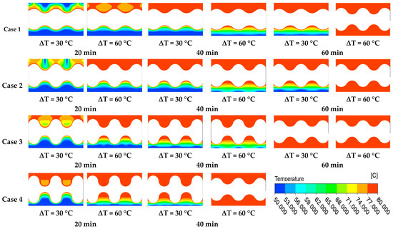Figure 6 illustrates the temperature distribution which is simulated via isotherms for the different time steps and temperature differences for different cases. It is noticed that temperature is constant for all heat exchanges at ΔT = 60 °C for all cases and 60 min. It means that all materials were melted in those conditions. The figure shows that the temperature started going to a higher degree for t = 20 min and ΔT = 30 °C from the top half side and reach constant temperature depends on the duration. On the contrary, the bottom half side of the heat exchanger has reached a constant temperature lately for all values of temperature difference. The main effective parameter on this is the studied cases.