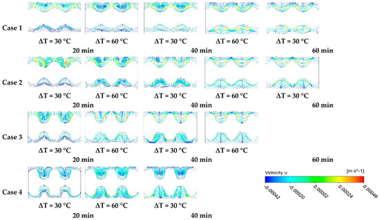 The effect of the internal amplitude ratio on melting time for paraffin wax in the system is presented in Figure 8 for different cases and temperature differences. There is a linear increase up to 0.8 of the value of the melting and then a plateau is shown for almost all cases. As seen from the figure, the best result is formed for Case 4 and ∆T = 60 °C on behalf of melting time. Additionally, the worst results are shown for Case 1. It means that the geometrical design is extremely important to make passive control of the melting of the PCM. As the internal amplitude ratio increases, the phase change process becomes accelerated up to value of 0.8. This is attributed to the higher local velocities and enhanced thermal transport with higher internal amplitude ratios. At the highest amplitude ratio, the occurrence of large vortices in the PCM zone results in performance degradation. At time t = 40 min, the melt fraction amount is obtained as 0.82, 0.87, and 0.93 for amplitude ratios of 0.4, 0.6, 0.8. At ∆T = 30 °C, the phase completion time for Case C2 is 82.66 min, while increasing the temperature speeds up the process and the time for C6 at ∆T = 60 °C is observed as 44 min. There is a 46.77% reduction in the phase completion time as the temperature is increased to 60 °C for Case C2. At ∆T = 60 °C, when different Cases C6 and C7 are compared, the phase completion time is reduced by about 24.5%, which shows the favorable impacts of amplitude ratio at higher temperatures.