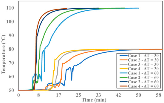 Time-dependent temperature distribution for various temperature differences for different cases.