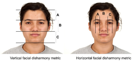 Facial disharmony was calculated using the method suggested by Suguino et al. [29], in which facial components from photos of female faces were measured. Distances between the hairline and eyebrows; the eyebrows and the lower part of the nose; the lower part of the nose and the lower part of the chin (Figure 1, A, B, C on the left); the sum of the differences between these distances we called vertical facial disharmony. We also measured the distance between the inner and outer corners (Figure 1, A and C on the right), and the distance between the inner corners of the eyes (the distance between eyes, Figure 1, B on the right). The sum of the differences between these distances are called horizontal facial disharmony. For both facial disharmony metrics, the larger the value, the more disharmonious the face would be. There are some discussions about the use of hairline in this type of calculation, because age can change its position. Here, we minimize this bias by selecting only women of similar age [28].