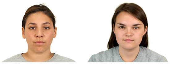 Eight female face photographs were chosen from Chicago Face Database (CFD), available on chicagofaces.org [39]. Face stimuli included photographs of young (aged between 20 to 25 years) female individuals with neutral facial expressions. All faces had similar skin, eyes, and hair color. The photograph spatial resolutions were 2444 × 1718 pixels and stimulus identification numbers in CFD are: LF-210-220; LF-213-079; LF-218-072; LF-227-054; LF-228-125; LF-229-164; WF-006-002; WF-007-001.