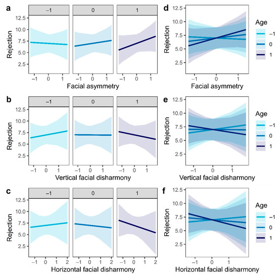 Effect of age on the rejection of facial asymmetry and facial disharmony on female faces. In (a–c) partial effects are shown of facial asymmetry (a), vertical facial disharmony (b), and horizontal facial disharmony (c) on facial rejection in different ages. In (d–f) the overlapping slopes are shown for all participant ages. Fixed effects (age, facial asymmetry, and facial disharmony) were previously standardized (centered and scaled). Age was grouped only for better visualization. Shaded areas show a 95% confidence interval.
