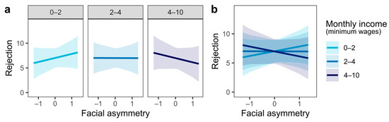 We also found a significant effect on the interaction between the participant’s monthly income and facial asymmetry (β = −1.66, SE = 0.54, p = 0.002) on the rejection of the presented faces (Table 1, Figure 5). It indicates that participants with higher monthly income tended to reject less the asymmetrical faces as compared to participants with lower monthly income (Figure 5a).
