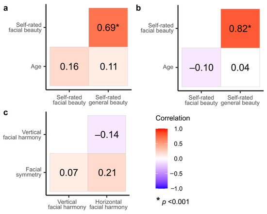 We tested the correlation between the main variables of the study and found only significant correlations between self-rated facial beauty and self-rated general beauty by using data from the rejection (r = 0.7) and attractiveness (r = 0.8) experiments (Figure 6). To avoid multicollinearity problems, all fixed effects were centered and scaled (see Section 2.5), and both Linear Mixed Models (rejection and attractiveness) were checked for multicollinearity by calculating the variance inflation factor (VIF) for each parameter. A VIF less than 5 indicates a low correlation between a single variable and the other variables in the model [46]. All variables had a VIF less than or equal to 2.04 (Table S3).