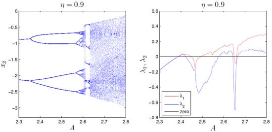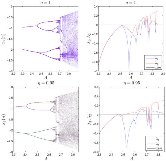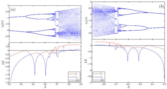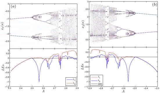 As the system parameters and the initial state variables of the 2D fractional system are taken as , , the bifurcation diagrams along with the LEs diagram for the fractional order value are shown in Figure 3a. As illustrated in the previous section, when , the FODTS (3) has a line of equilibria. When the bifurcation A increases from 2.3 to 2.9, it can be seen from the bifurcation diagram that the FODTS starts from the period and goes into chaos via the cascade of period-doubling bifurcation and then turns into hyperchaos at interval . In contrast, when the parameter A is adjusted in the region , the bifurcation of the state and the LEs are numerically simulated as shown in Figure 3b. Similarly, it is easily viewed that the bifurcation diagram in Figure 3b had certain symmetrical similarities with the one reported in Figure 3a. Therefore, it proves that the coexistence behavior appears in the hidden attractors of the FODTS with the lines of the equilibrium points.