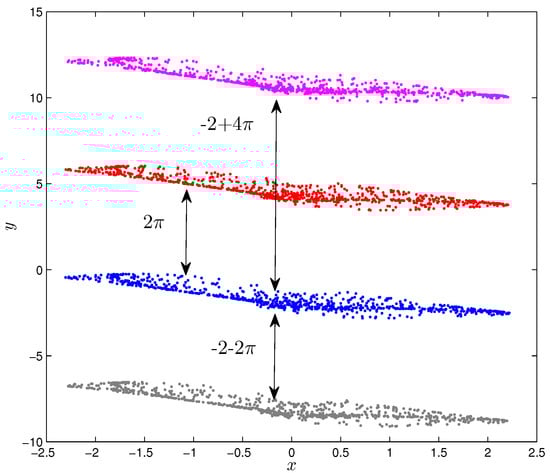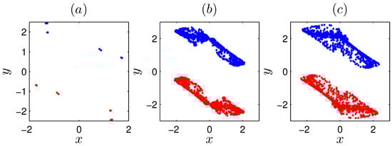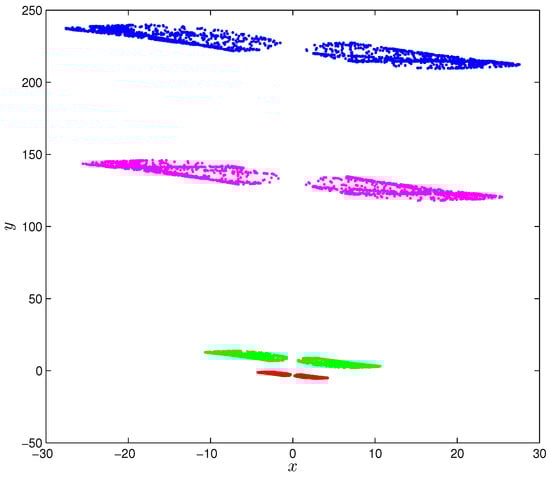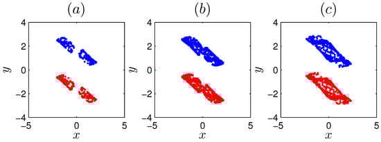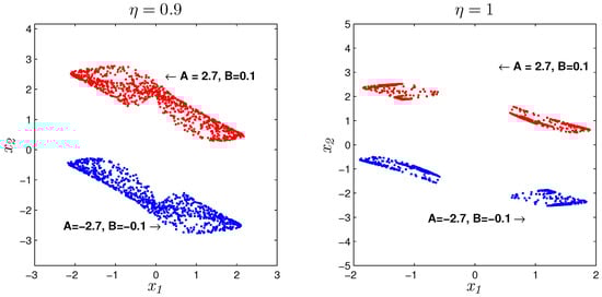 To observe the coexistence of hidden symmetric attractors in the FODTS (3), the phase portraits, as seen in Figure 1, are disposed of in Figure 2. Red trajectories were obtained for the constant parameter , fractional order , and the initial values ; blue trajectories were obtained for , , . For different values of A, the FODTS shows symmetrical hidden periodic attractors, symmetrical hidden chaotic attractors, and symmetrical hidden hyperchaotic attractors. Therefore, it is concluded that the FODTS has complex hidden dynamics. Moreover, the coexistence behavior indicates the sensitivity of the map (3) to the control parameters and initial values.