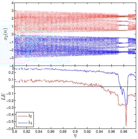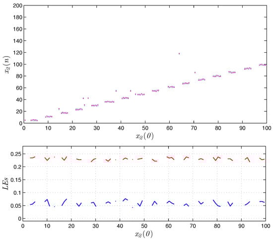 In order to further understand the dynamics of the FODTS, the fractional order is considered a bifurcation parameter, and the bifurcation diagram along with the LEs are derived as shown in Figure 5. Note that the blue diagram is obtained for the initial condition and system parameters , while the red diagram is obtained for , , with initial conditions , . It is observed that the new FODTS produces more complex dynamics compared with the integer-order map (1). In particular, for the corresponding integer-order value , the FODTS is chaotic where the maximum LEs is bigger than 0. However, it becomes hyperchaotic as the fractional order value decreases, where both of the Lyapunov exponents become bigger than 0, which indicates that the dynamic characteristic of the FODTS is more complex. Moreover, when , the FODTS (3) is in hyperchaos, where with some unbounded region for the largest values of n. When the FODTS is in chaos, where . The phase portraits for the fractional order values and , which are associated with the hidden hyperchaotic and hidden chaotic attractors, respectively, are illustrated at the top of Figure 5.