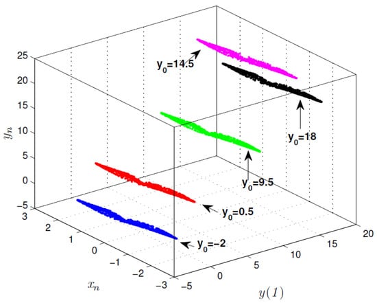 To reveal the extreme multistability of the FODTS (3), the maximum LEs and the bifurcation diagrams of the state variable are calculated as shown in Figure 7, where the fractional order is chosen as . The parameters are selected as , , and the IV is fixed as , while varies in the range . As shown in Figure 7, when , system (3) generates multiple chaotic attractors along the axis, where the values of the LEs of the FODTS (3) are nearly the same, which indicates that all of these attractors have very close chaotic features. To exhibit the phenomenon of multistability, typical hyperchaotic attractors of the FODTS (3) with no equilibrium for a different IV are simulated, as shown in Figure 8. As can be seen, different initial condition values lead to different hidden hyperchaotic attractors of the same shape. This special phenomenon is known as homogeneous multistability, which is a new phenomenon in nonlinear systems []. The hidden homogeneous multistability of the FODTS (3) (with respect to small changes of the initial state ) is illustrated. Note that there are many other hidden hyperchaotic attractors with unified LEs for other IVs.