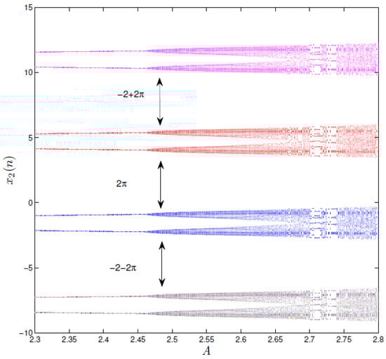In the following, we will discuss an unusual phenomenon of the new FODTS, namely the initial offset boosting by changing the IV with the period as with the fixed order , where and . In Figure 9, we present the bifurcation diagrams of system (3) when and . For four different values of IC , the FODT systems experience four bifurcation diagrams with periods . All of these diagrams have the same structure with the regime of homogenous multistability. The same result can be obtained if we consider the second case .