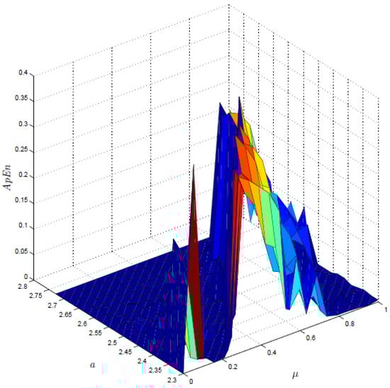 In this section, the complexity of the FODTS (3) is analyzed using the approximate entropy (ApEn) []. An approximate entropy indicates how complex a system generated by a time series is. In general, a time series with the largest values of ApEn is considered as being more complex. ApEn can be calculated for both continuous and discrete systems and integer and fractional orders. Firstly, the calculating process of the algorithm is presented []. For the specific calculating method, we consider N points of the state ; the specific steps are as follows: