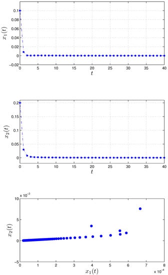 As shown in Section 3, the FODTS (3) with , and display chaotic behavior. Figure 13 depicts the evolution of states and the phase space plot of the controlled FODTS (3), respectively. As one can see, the FODTS (3) is completely controlled in a stable state. These plots confirm that the hidden chaotic dynamic of the FODTS is controlled effectively.